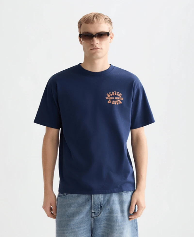 Easygoing and contemporary, this regular-fit Scotch & Soda T-shirt displays artwork on the chest and back. The collarless, short-sleeve design makes it a classic everyday essential.