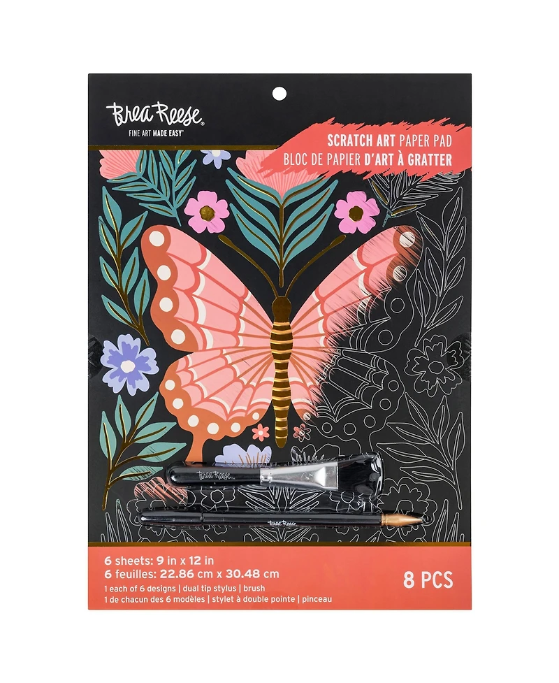Scratch Art: Paper Pad - Butterfly Garden - Immerse yourself in the beauty of nature with the Brea Reese Scratch Art Paper Pad - Butterfly Garden. Scratch and Display! Follow the outlines to reveal the art beneath. Scratch as much or as little as you like! Featuring 6 enchanting designs, this guided kit allows you to reveal delicate butterflies and vibrant florals with every scratch. Bursts of color and metallics bring these garden scenes to life, creating art that radiates elegance and tranquility. With a dual-tip stylus and brush included, this kit makes it easy to craft each detail with precision. The perforated pages are designed for effortless removal, so you can frame your finished artwork to brighten up any room. Craft kit Includes 6 Design Sheets (9" x 12"), 1 Brush, and 1 Dual-Tip Stylus.