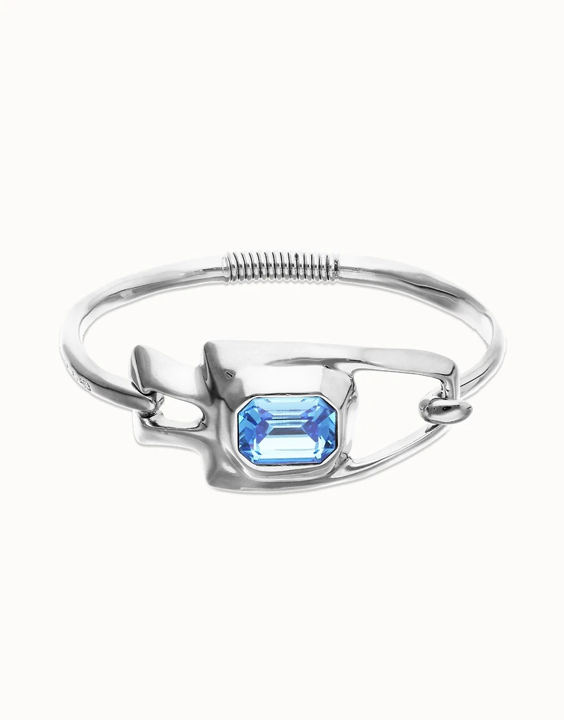 Silver-tone bracelet featuring a faceted blue crystal as the central element of the design.