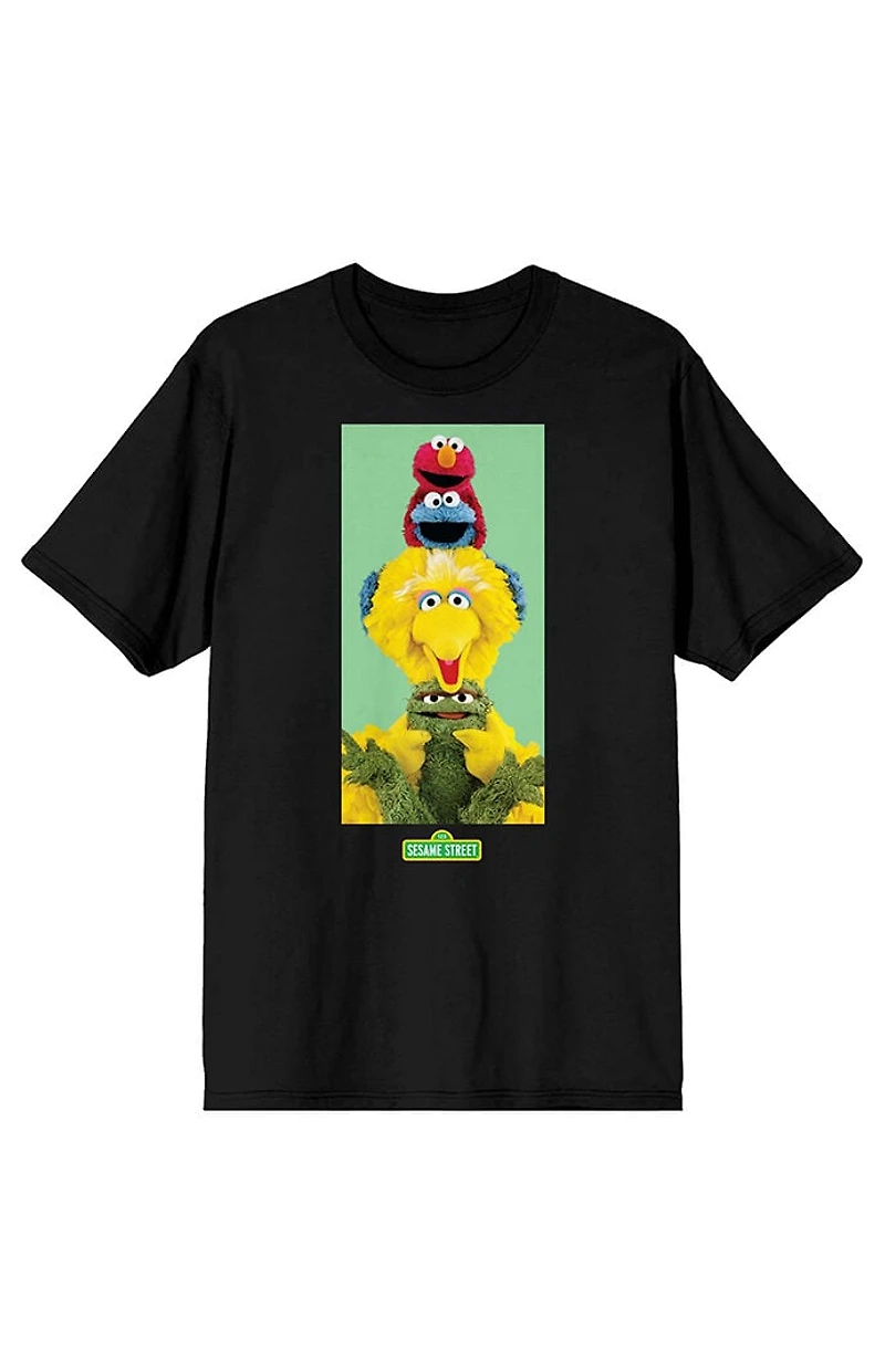 online only! explore the neighborhood with this sesame street tee. the shirt features elmo sitting on cookie monster's head as cookie monster sits on top of big bird. oscar the grouch sits in front of the characters at the bottom of the image. the tee comes in a black short sleeve crew neck. celebrate your favorite tv shows in style with this sesame street shirt.