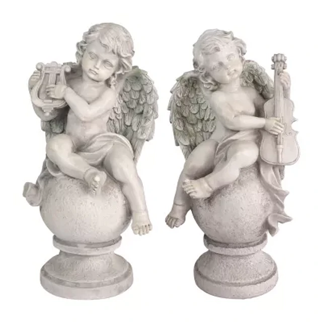 Set of 2 Cherub Angels with Violin and Harp on Finials Outdoor Garden Statues 15.25"