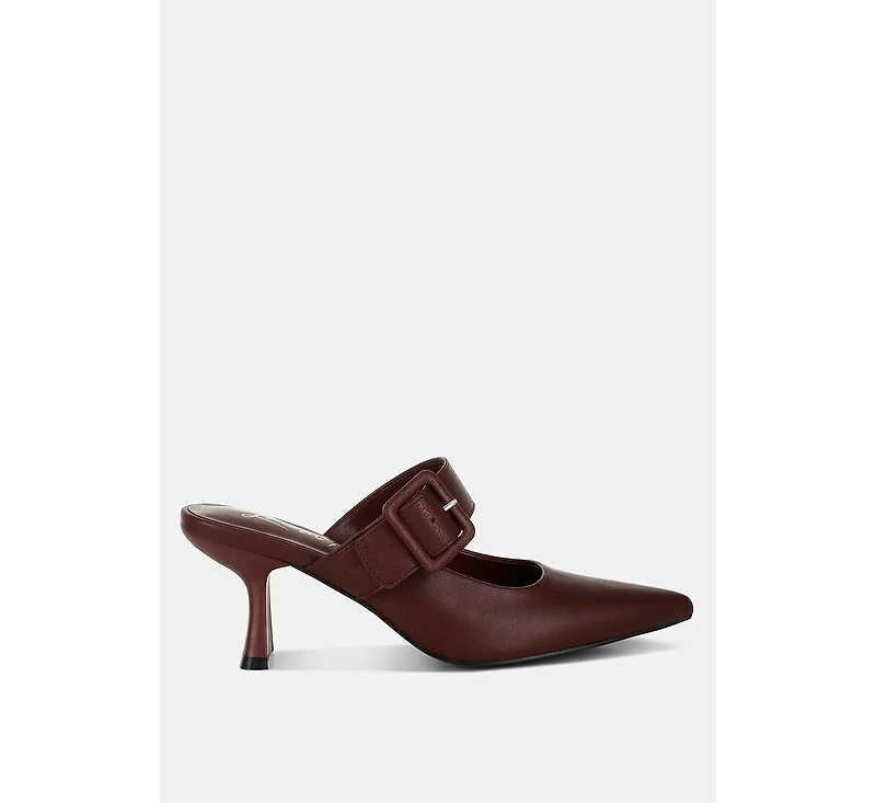 The slim block heel mules make for the perfect slip-on style for fashionistas, making them all-day wear. These chic light-cushioned party heels for women can be a great addition to your summer wardrobe.Type: Heel MulesUpper Material: Faux LeatherLight Cushion InsoleOuter Sole: TPRSlim Block HeelClosed Pointed ToePin Buckle DetailSH4068