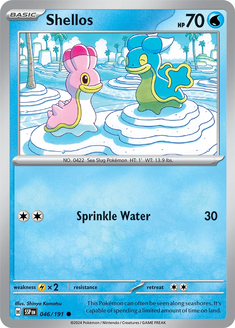 Set: Scarlet & Violet: Surging Sparks Card Number: 046/191 Rarity: Common Card Type: Water Name: Shellos Finish: Reverse Holo