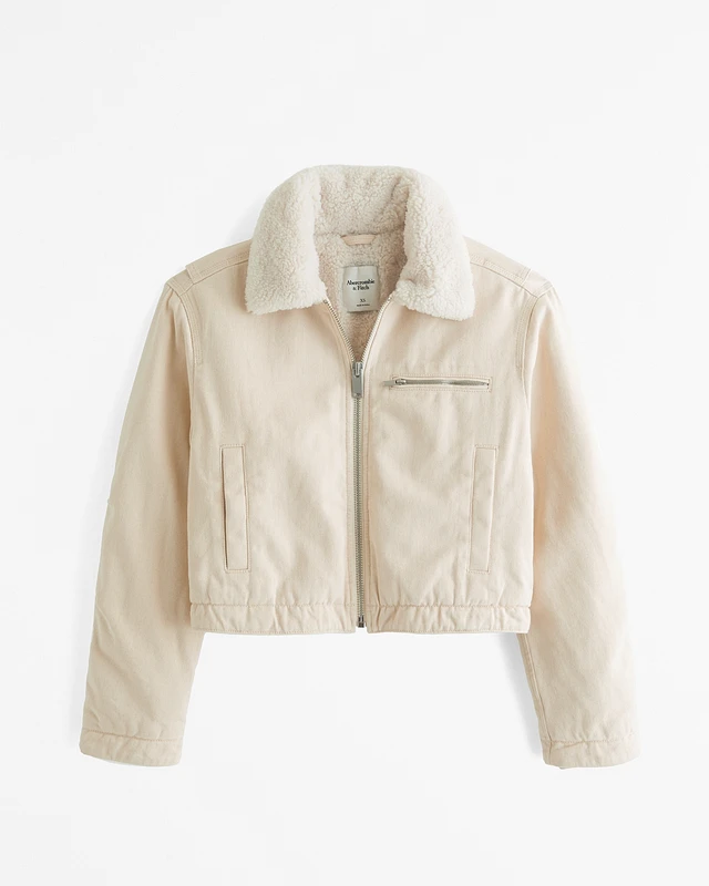 Sherpa-Lined Cropped Twill Workwear Jacket