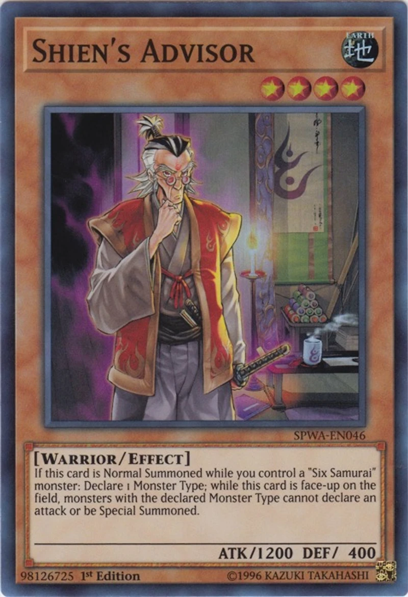 Passcode: 98126725 Set: Spirit Warriors ATK/DEF: 1200 / 400 Card Number: SPWA-EN046 Monster Type: Warrior / Effect Rarity: Super Rare Attribute: EARTH Card Text: If this card is Normal Summoned while you control a "Six Samurai" monster: Declare 1 Monster Type; while this card is face-up on the field , monsters with the declared Monster Type cannot declare an attack or be Special Summoned. Level: 4 Name: Shien's Advisor Edition: 1st