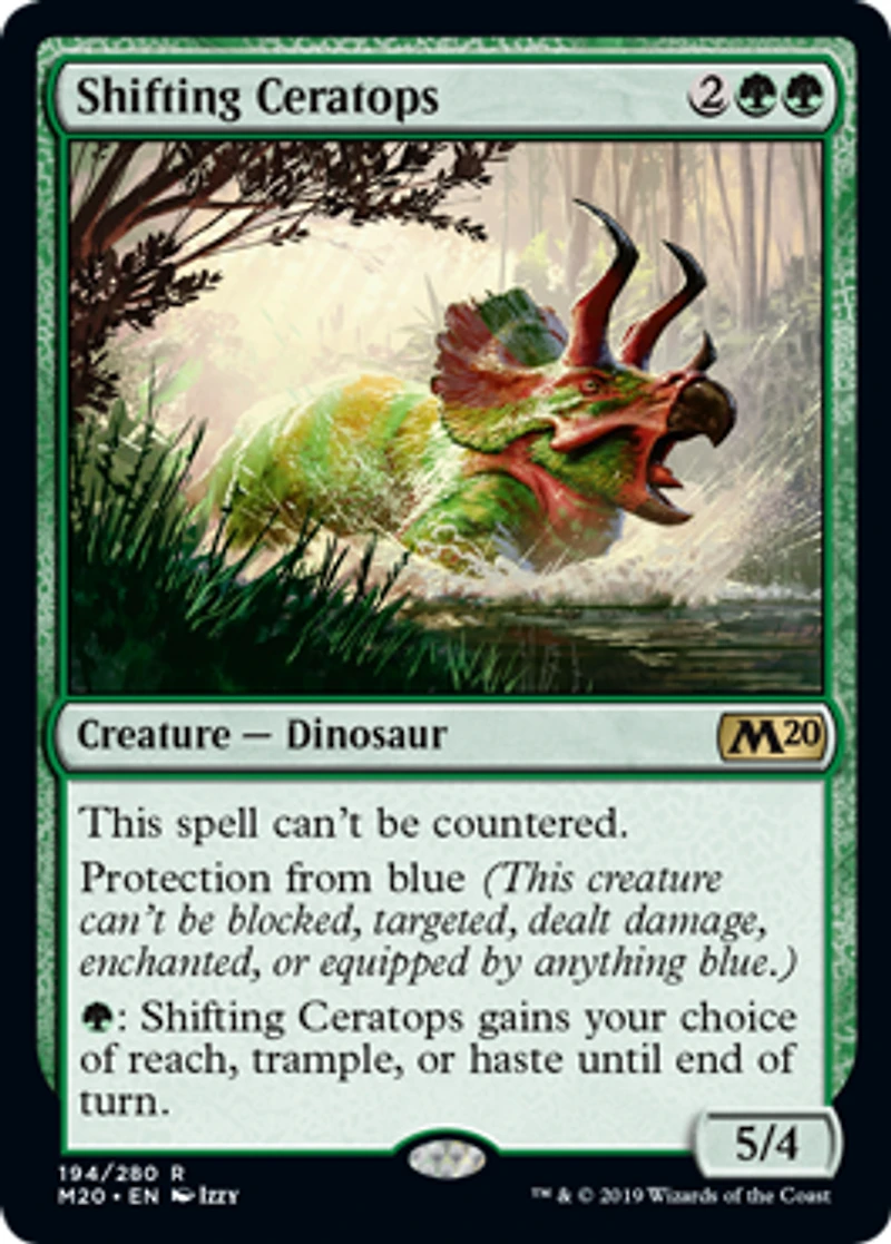 Color: Green Card Text: This spell can't be countered.Protection from blue (This creature can't be blocked , targeted damaged enchanted or equipped by anything blue.)G: Shifting Ceratops gains your choice of reach trample or haste until end of turn. Rarity: R Cost: 2GG Pow/Tgh: 5/4 Card Type: Creature - Dinosaur Artist: Izzy Name: Shifting Ceratops Finish: Foil Card Number: 194/280 Set Name: Core Set 2020