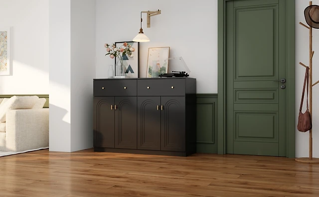 Shoe cabinet in black wood, shoe rack with 2 drawers and four doors and metal handles