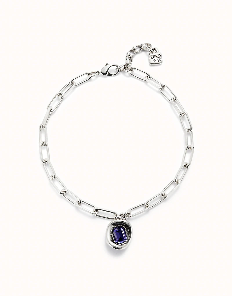 Sterling silver-plated chain with links and a central faceted purple crystal piece. Made in Spain with a 100% handmade process.Now is the time to trust your instincts and choose jewelry that you always wanted but never dared to wear. Choose links if you dare to go further. Discover the collection ser valiente.