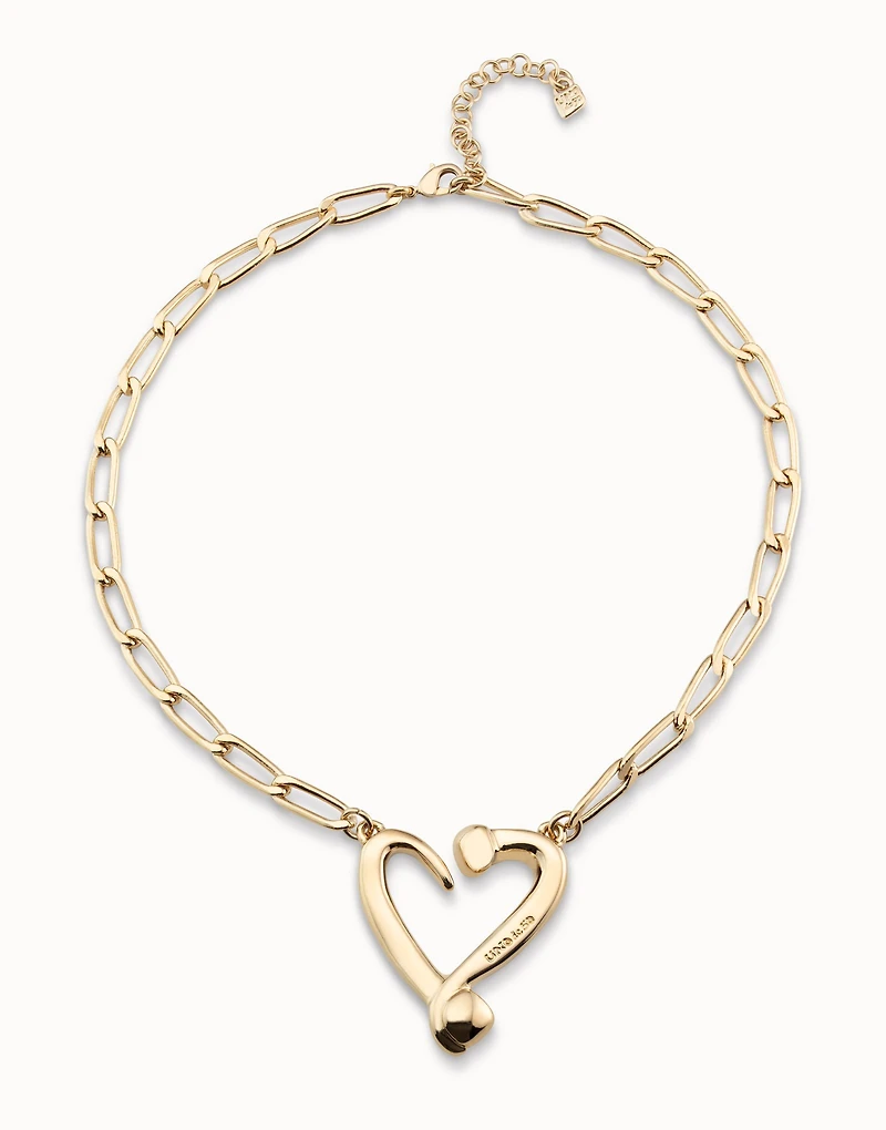 18K gold-plated necklace with thin nail-shaped links joined together and with a mid-sized heart in the center. 100% handmade in Spain with an adjustable clasp.