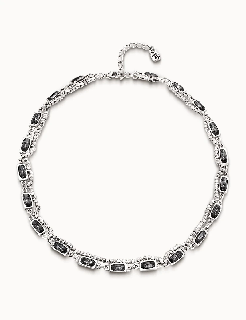 Short sterling silver-plated necklace with a strip of small beads and 22 cases with gray crystals. Its carabiner clasp allows to fit the necklace to the desired size. This necklace is handmade in Spain.