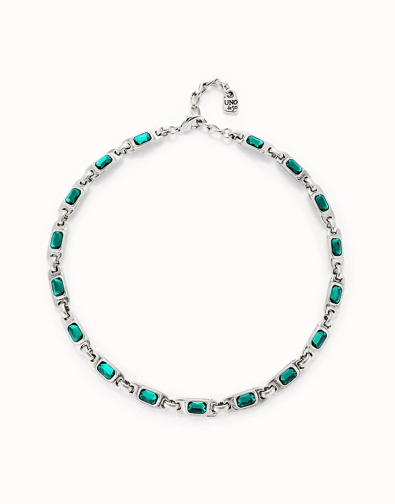 Short sterling silver-plated necklace with faceted green crystals. Made in Spain with a 100% handmade process.These pieces of jewelry are an art exhibition composed of bracelets, rings, necklaces and earrings, where each piece is a work of art in which we find emerald style cut crystals and pieces with layers of geometric shapes. Discover the collection ser magnética.