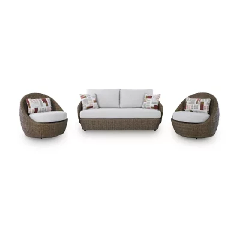 Poolside comfort and style have never been so chic. With this outdoor loveseat and swivel chairs set, lounging alfresco is effortlessly cool. The woven resin wicker combines intricate beauty with a dose of durability. High-performing fabric helps to keep pillows and cushions looking fresh over time. And with the swivel chairs' rounded silhouettes, luxe outdoor living is within easy reach.