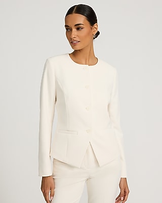 This collarless cutaway blazer is expertly tailored to hug every curve, for comfortable confidence all day long. For a chic and timeless look, this style features a crew neckline, a four button front, and a cutaway hem.