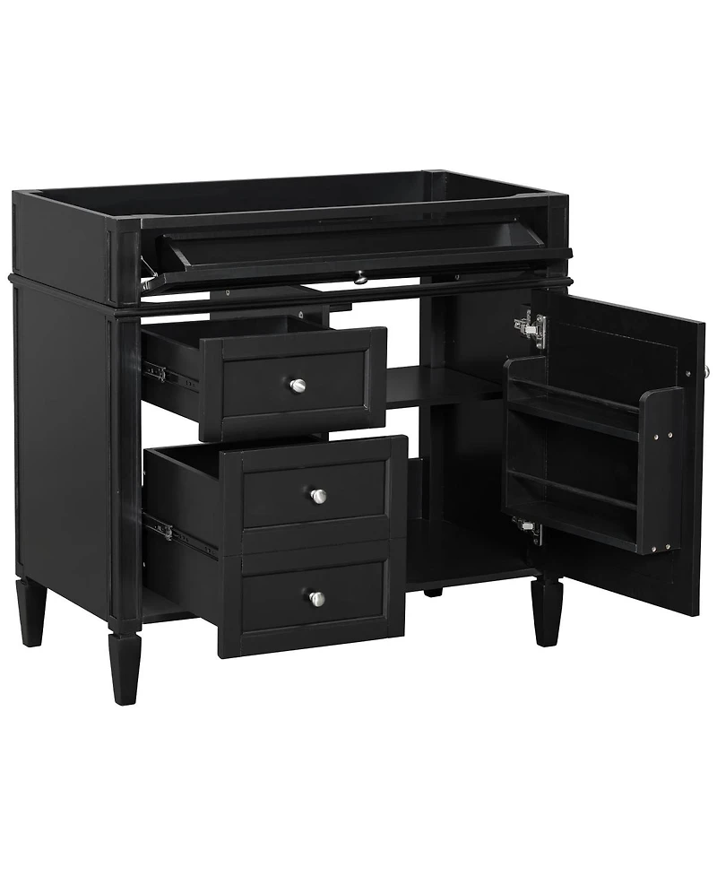 Upgrade your bathroom with a modern vanity designed for style and efficiency. This 36-inch cabinet, crafted without a top sink, features soft close drawers and an adjustable shelf, making it easy to organize toiletries and essentials. The tip-out drawer and handy door organizer maximize available space, ideal for compact bathrooms or apartments. Built from solid wood and Mdf, this vanity ensures lasting durability and a premium feel. Subtle details like Roman-style legs and textured handles elevate the design for a clean, sophisticated look. With simple instructions and marked parts, assembly is straightforward, so you can enjoy an organized, beautiful bathroom in no time.