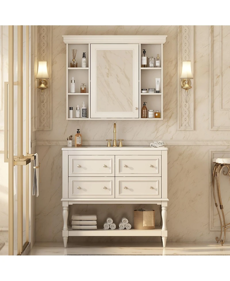 Upgrade your bathroom with this luxury vanity set, designed for both elegance and maximum organization. The set features a spacious 36'' vanity crafted from solid wood and Mdf for long-lasting durability. Its premium ceramic sink is easy to clean and resists stains, while the pre-drilled three-hole basin fits most faucets for effortless installation. Four extension drawers and an extra-large open shelf provide generous storage for your toiletries, towels, and essentials. The included mirror cabinet adds concealed space, keeping your bathroom neat and stylish. With a waterproof painted finish, silver handles, and meticulous craftsmanship, this vanity set brings a touch of modern luxury to any bathroom. Step-by-step instructions make assembly easy and efficient.