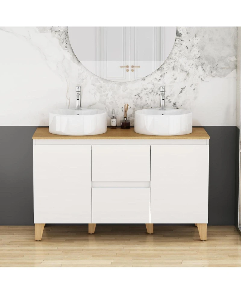 Transform your bathroom into a luxurious shared retreat with this expansive 47-inch double vanity. Featuring a solid wood top and sturdy feet, this modern centerpiece is both visually warm and structurally reliable. The two round ceramic basins sit gracefully above the wide, handle-free cabinet, creating an inviting blend of soft curves and sleek lines. Oversized soft-close drawers and double doors provide ample storage for towels, toiletries, and shared essentials, making busy mornings smooth and organized. A glossy cabinet finish brightens roomy spaces and is easy to wipe clean, keeping your vanity fresh every day. With step-by-step instructions and all necessary hardware included, installation is a breeze-perfect for both quick upgrades and complete renovations.