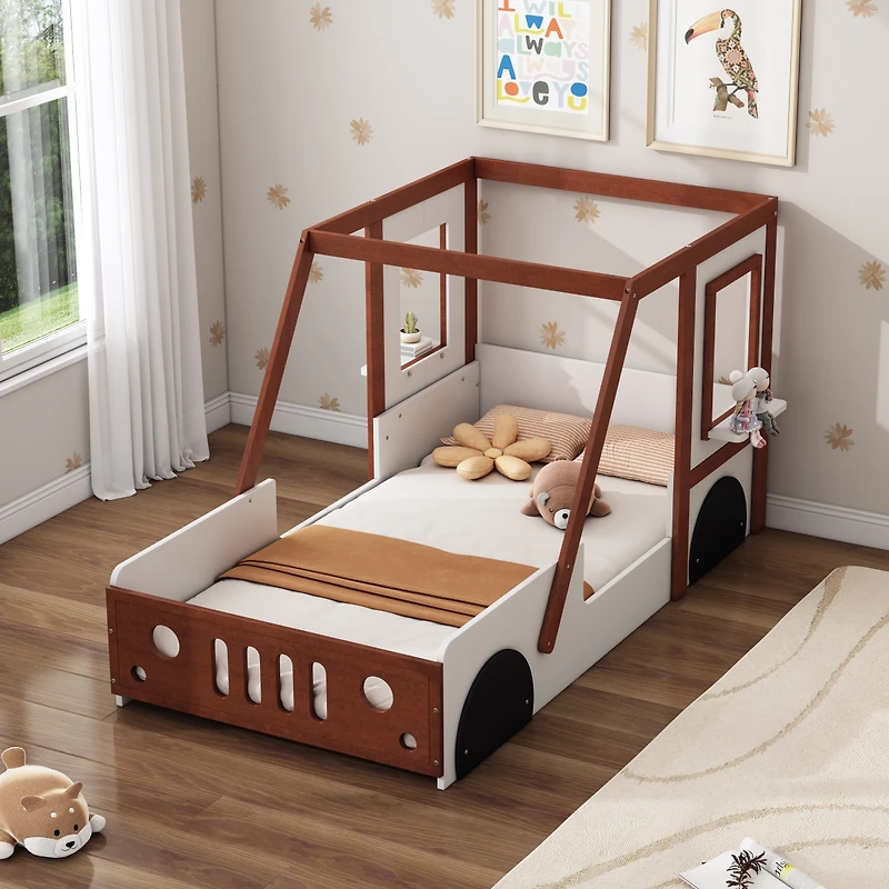 This twin size car bed features an attractive car design, solid wood frame, and a decorative frame that encourages imaginative play, making it a versatile and safe addition to any child's room.