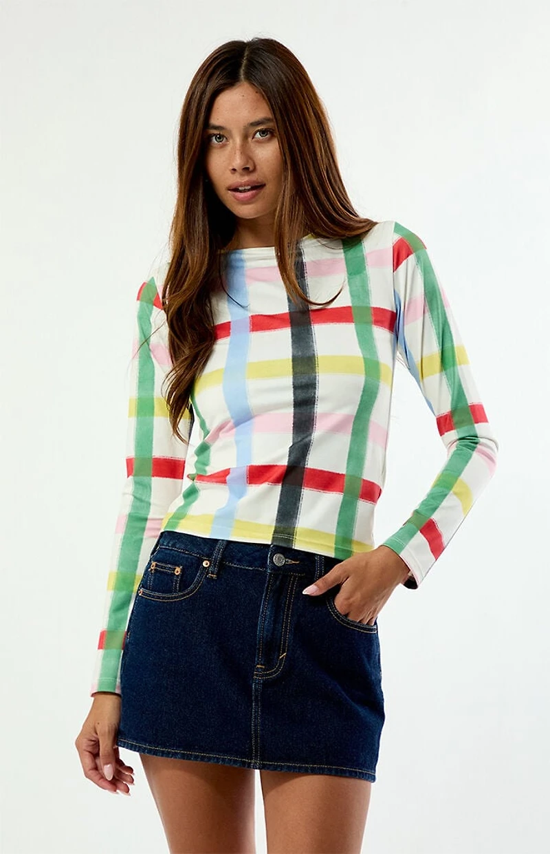 Brighten up your everyday look with the Rainbow Confetti Long Sleeve Top from Sixxta, serving playful, feel-good vibes. Featuring a colorful plaid print, long sleeves, a classic crew neckline, and a slim fit for an effortlessly flattering silhouette.