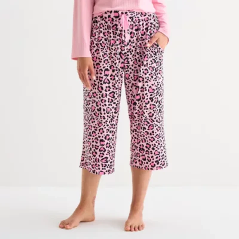 Stay stylish and comfortable with this pair of pink leopard-print Sleep Chic women's pajama capri pants. Made from lightweight jersey, this cropped pair has a drawstring waist and pockets. Wear it with a pajama top or tee.