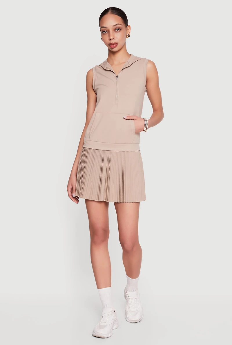 This sleeveless mini dress features a hooded neckline and a half zip front for easy wear. Its classic fit and skater silhouette create a timeless, flattering shape. Designed for casual days, it includes a kangaroo pocket for practical style. Hooded neckline adds sporty appeal and versatility Half zip front allows adjustable coverage and easy on-off Kangaroo pocket combines function with laid-back style Classic fit skater shape flatters a range of body types Model Pictured Wearing Size S Height 5 ft 10 in, Bust 32 in, Waist 22 in, Hips 36 in Fits True To Size Measurements Full Length: 31 in Content and Care Material: SELF: 80% Polyester, 20% Spandex, LINING: 95% Polyester, 5% Spandex Care Instructions: Machine Wash, Tumble Dry Country Of Origin: China Rainbow Item Number 1094060588701 STONE - 1094060588701403