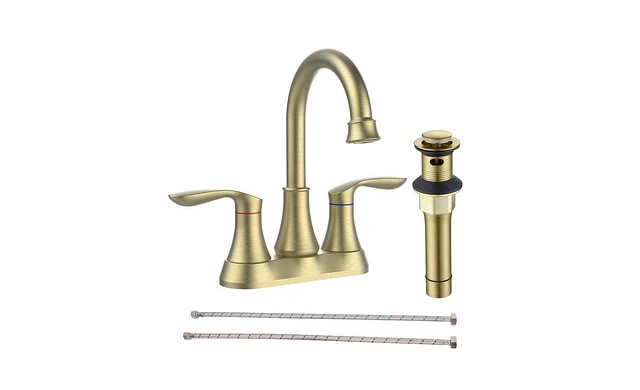 Slickblue Brushed Gold Bathroom Faucet with Pop-Up Drain & Supply Hoses, 2-Handle 360-Degree High Arc Swivel Spout, 4-Inch Centerset Vanity Sink Fauce