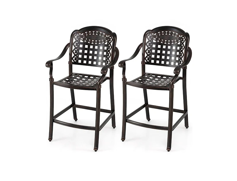 Complete your outdoor entertaining space with this set of 2 counter-height bar stools, designed at 25.5 inches to pair perfectly with patio bars, kitchen islands, or outdoor counter tables. Crafted from durable cast aluminum, these bar chairs offer a sturdy yet lightweight construction that resists rust, corrosion, and weather damage for long-lasting outdoor use. The supportive backrest and integrated footrest enhance comfort, while the openwork design promotes airflow and adds a touch of timeless style to your patio or deck.