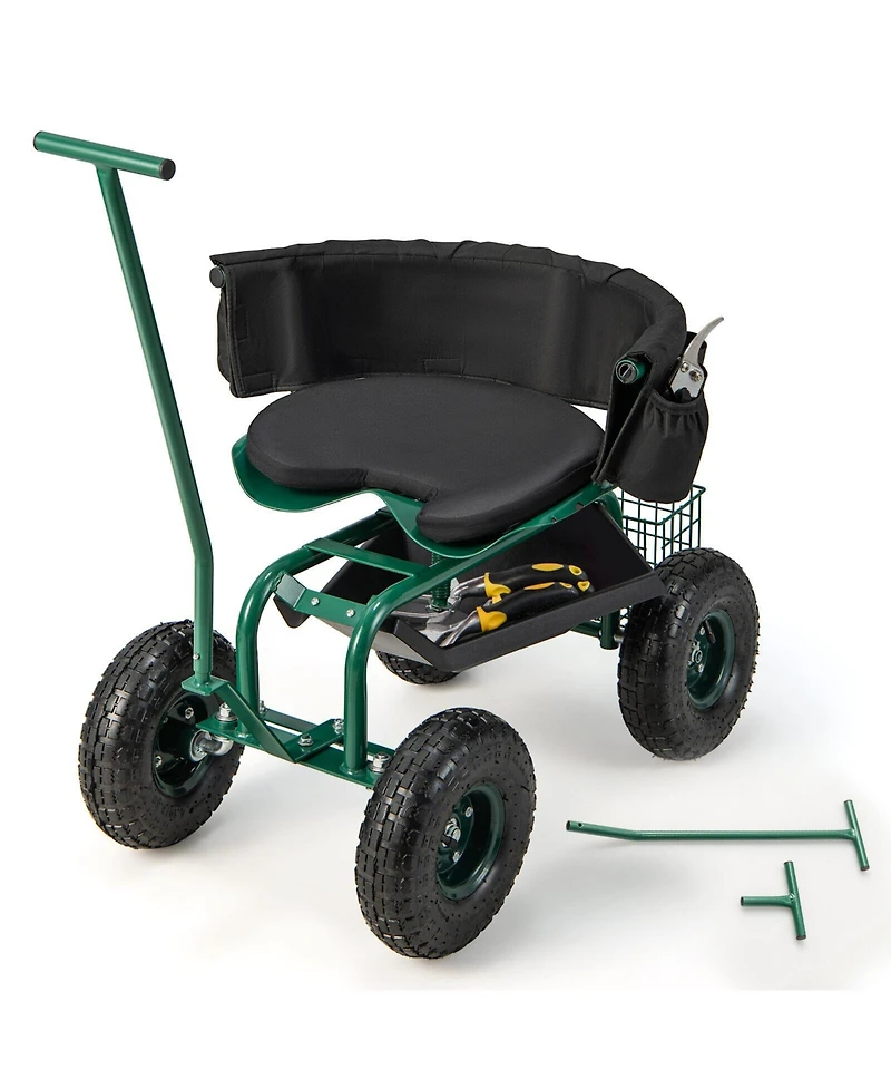 Slickblue Rolling Garden Cart with Height Adjustable Swivel Seat and Storage Basket-Black