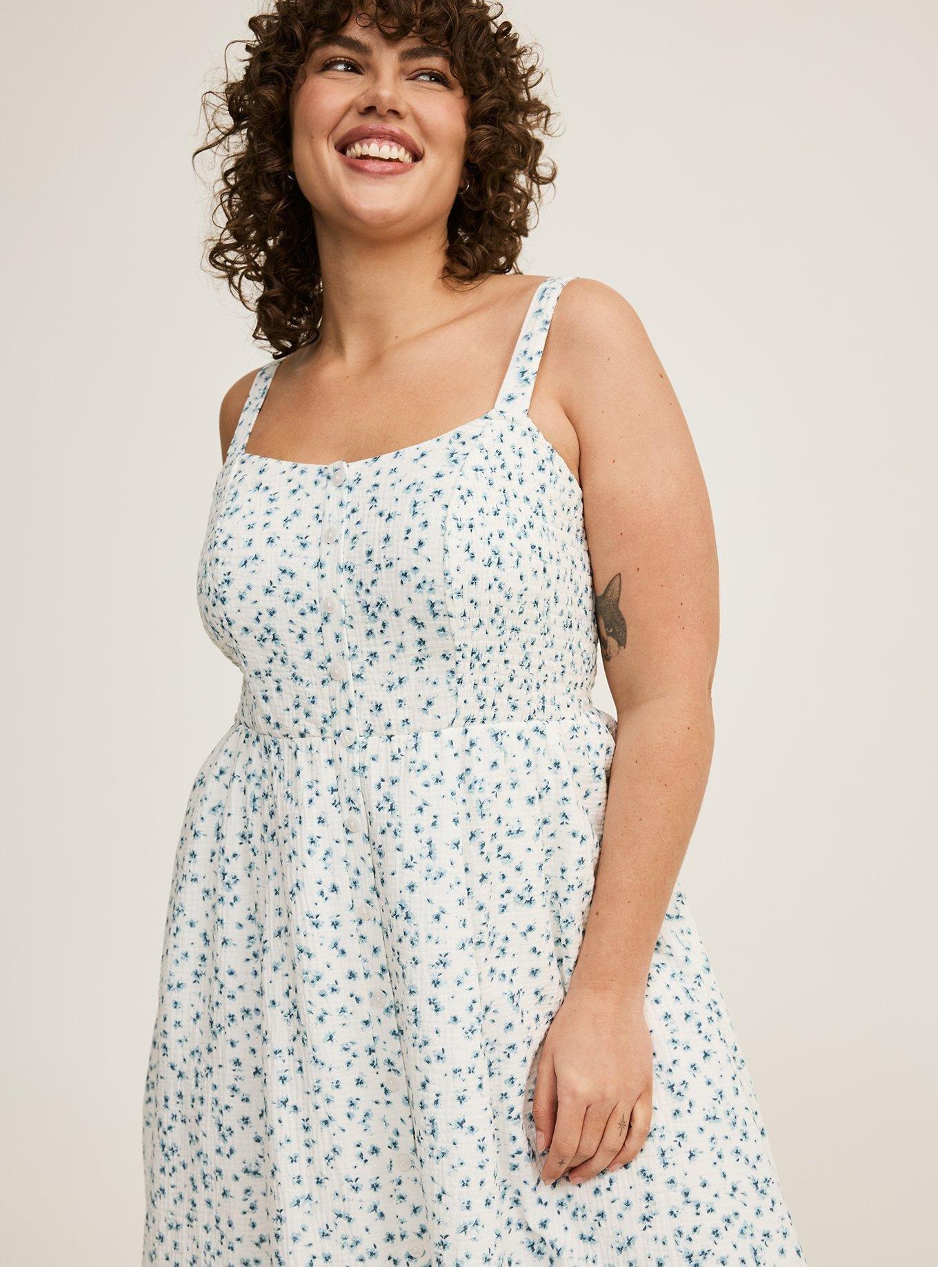 FIT Measures 48"" from shoulder (size 2). MATERIALS + CARE Crinkle Gauze woven fabric: Lightweight, textured, breathable and still totally opaque. Stretch level: None. 100% rayon. Dry clean only. Imported. DETAILS Scoop neck. Sleeveless. Smocked details. Button front. Adjustable straps. Functional pockets.