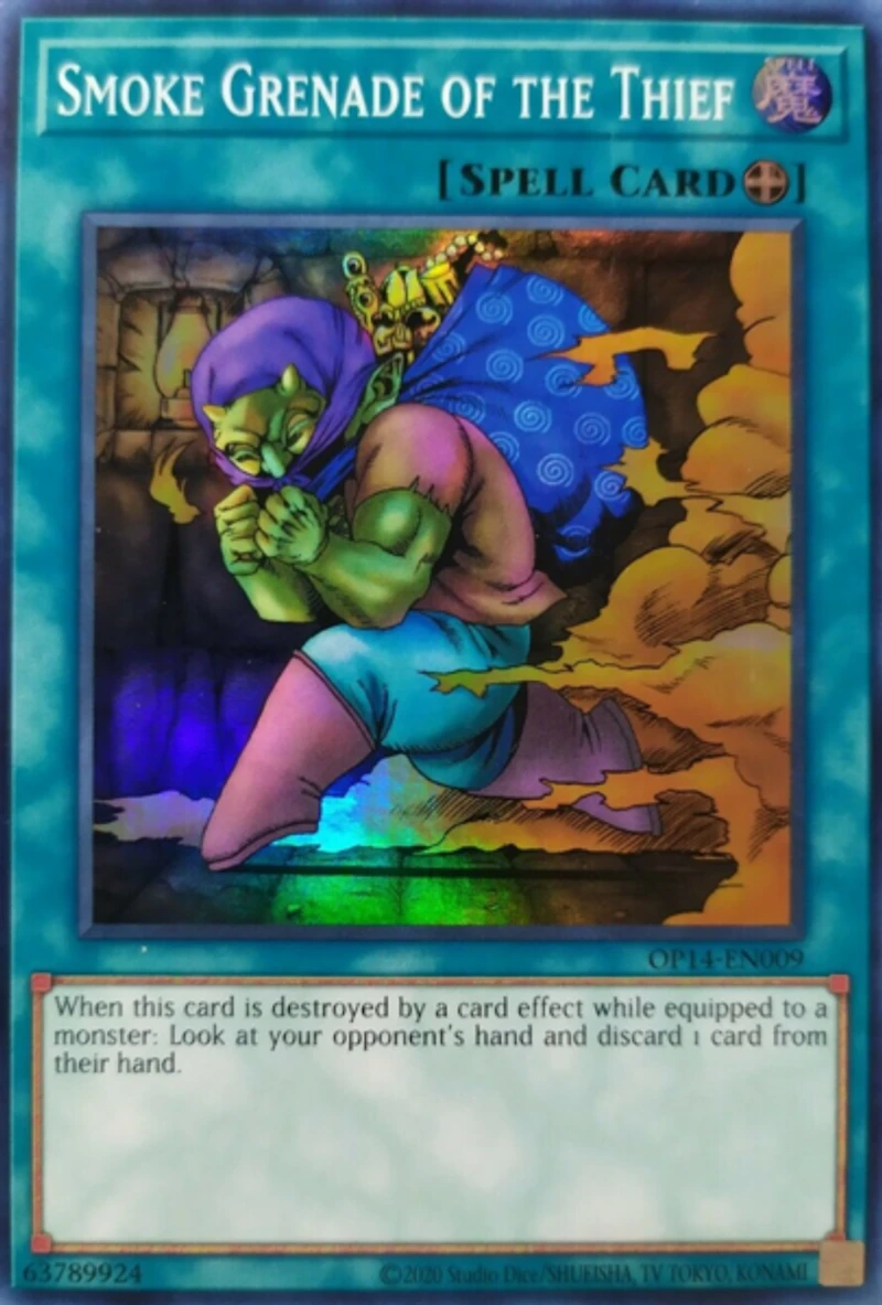 Passcode: 63789924 Set: OTS Tournament Pack 14 Card Number: OP14-EN009 Rarity: Super Rare Card Text: When this card is destroyed by a card effect while equipped to a monster: Look at your opponent's hand and discard 1 card from their hand. Card Type: Equip Spell Name: Smoke Grenade of the Thief Edition: Unlimited