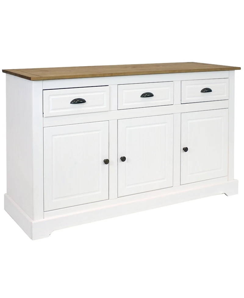Store kitchen supplies or provide a convenient surface for serving snacks and drinks with this elegant sideboard cabinet. Made of solid pine, this classic furniture piece features a two-tone color scheme with a wood tabletop and a white finish. Its retro drawer pulls and molding will complement a variety of decor styles and furniture pieces. The drawer pulls, doorknobs, and hinges are made from zinc alloy. It features three drawers with steel drawer slides for smooth opening and closing and three cabinets for an abundance of storage space. Plus, the cabinets feature an adjustable, built-in storage shelf for even more organization opportunities. This versatile piece can be used in the kitchen or dining room to store silverware, flatware, or pots and pans, or place this cupboard in the utility room to store cleaning supplies, craft supplies, hand tools, and other knickknacks.