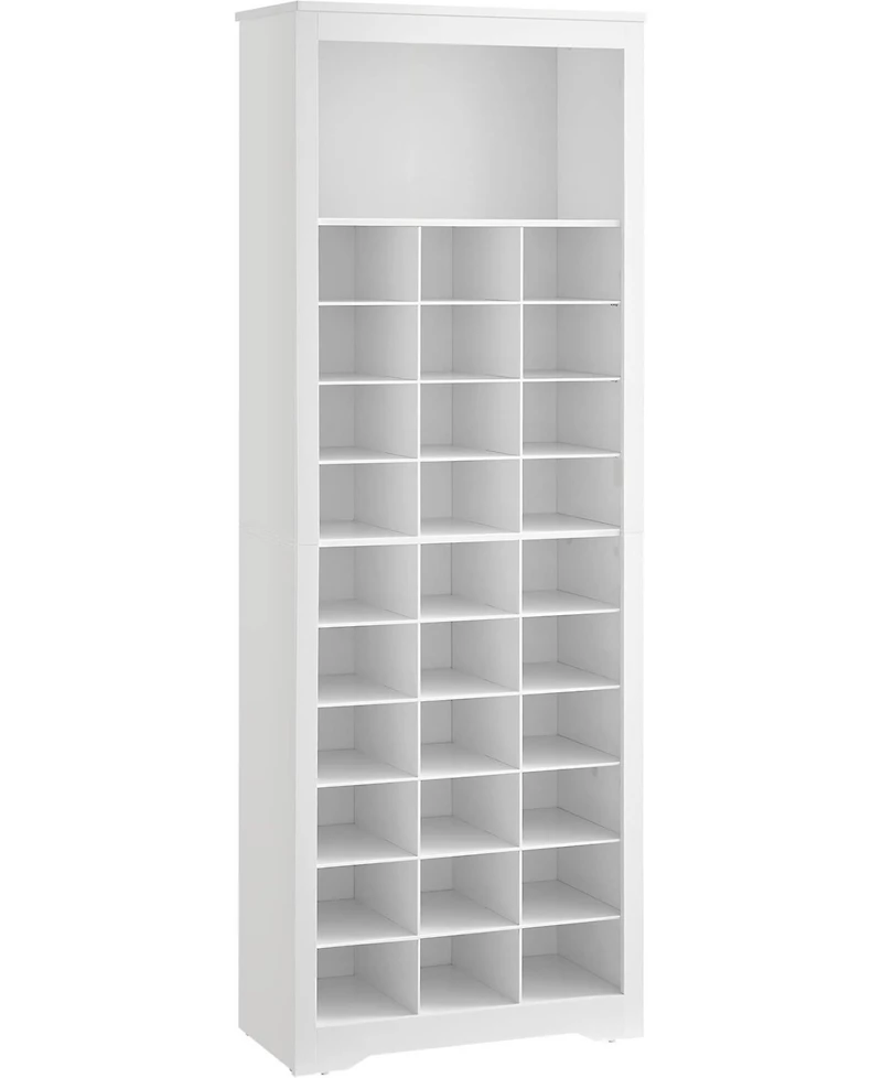 This tall shoe cabinet stores up to 30 pairs of shoes while occupying minimal floor space. The top compartment also provides ideal storage for shoe boxes and baskets. Featuring an extended top edge, curved base, clean lines, and an elegant finish, this cabinet adds a touch of charm and sophistication to any room. With compartments sized at 11.8" D x 7.1" W x 5.3" H, it fits flats, sneakers, and heels comfortably. Plus, removable shelves allow space for taller boots.
