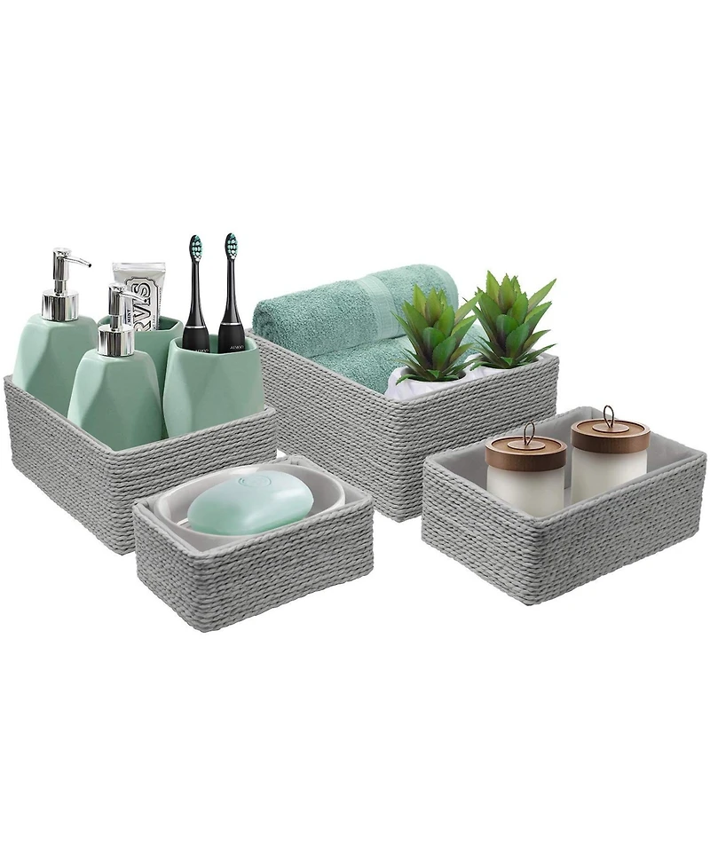 The Sorbus Storage Baskets are the perfect way to organize your bathroom, vanity, or open shelving. This organizer bin set is versatile for any space. Organize your office, nursery, pantry, laundry room, and more. The paper rope material and soft design complement many home decor styles. Tuck away toiletries, nursery items, office supplies, snacks, laundry supplies, cosmetics, makeup, skincare, and more. This is an excellent set for small spaces, especially apartments and college dorm rooms. Maximize your storage possibilities with this four-piece set. Its the perfect storage solution for any drawer, shelf, or tabletop, so you can stay organized in style.