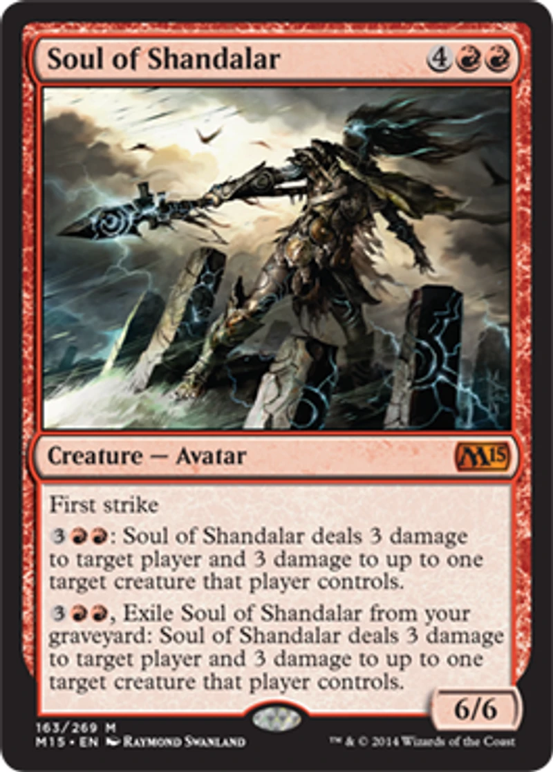 Color: Red Card Text: First strike3RR: Soul of Shandalar deals 3 damage to target player and 3 damage to up to one target creature that player controls.3RR , Exile Soul of Shandalar from your graveyard: Soul of Shandalar deals 3 damage to target player and 3 damage to up to one target creature that player controls. Rarity: M Cost: 4RR Pow/Tgh: 6/6 Card Type: Creature - Avatar Artist: Raymond Swanland Name: Soul of Shandalar Finish: Foil Card Number: 163/269 Set Name: Magic 2015