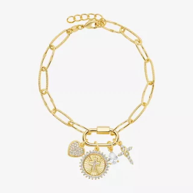 Sparkle Allure Carabiner Womens White Cubic Zirconia 14K Gold Over Brass Cross Heart Charm Bracelet