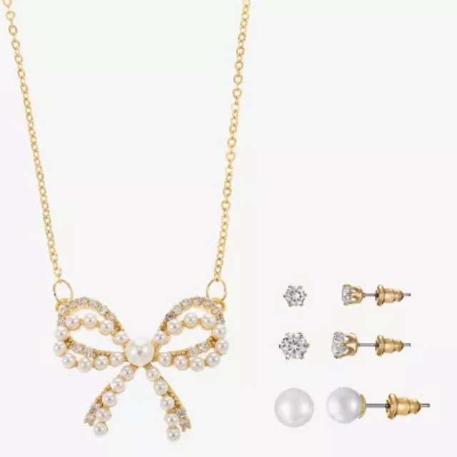 Sparkle Allure Light Up Box Womens Cubic Zirconia Simulated Pearl 14K Gold Over Brass Bow 4-pc. Jewelry Set