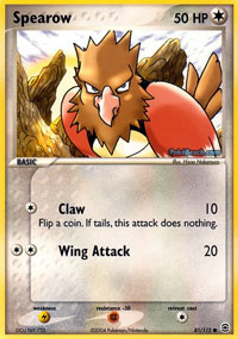 Set: EX FireRed & LeafGreen Card Number: 81 Rarity: Common Illustrator: Hisao Nakamura Retreat Cost: 1 Weakness: HP: 50 Stage: Basic Card Type: Colorless Resistance: Name: Spearow Finish: Regular Manufacturer: The Pokemon Company
