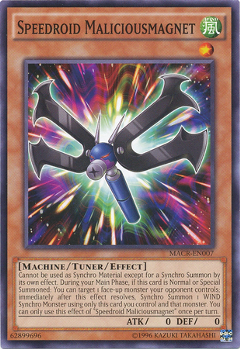 Synchro Summon 1 WIND Synchro Monster using only this card you control and that monster. You can only use this effect of "Speedroid Maliciousmagnet" once per turn.