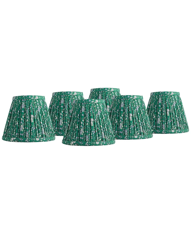 Brighten the look of a fixture or lamp with this set of six shades from the Springcrest brand. The design has a tight pleat using a violet floral patterned fabric. The decorative pattern is set against a green color background, and the shade has a white polystyrene liner. Set of six clip-on lamp shades.