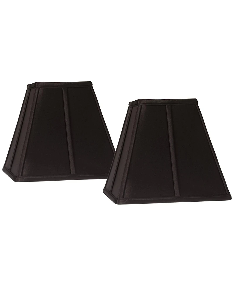 A set of two square sided lamp shades comes in a glamorous Bavaria black fabric. Self trim on the outside for a crisp, finished look. Inside the shade is lined with a beige fabric for warm ambiance.