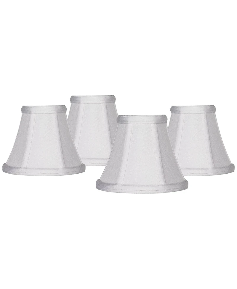 A new shade on a chandelier or fixture is an easy way to add a fresh look to your decor. This set of 4 white fabric shades have a classic look ideal for a wide variety of designs and room styles. The set is from the Springcrest Shade Collection brand, and features self trim top and bottom with vertical fold accents. Polished brass clip fitters attach to a bulb and provide an elegant finished look.