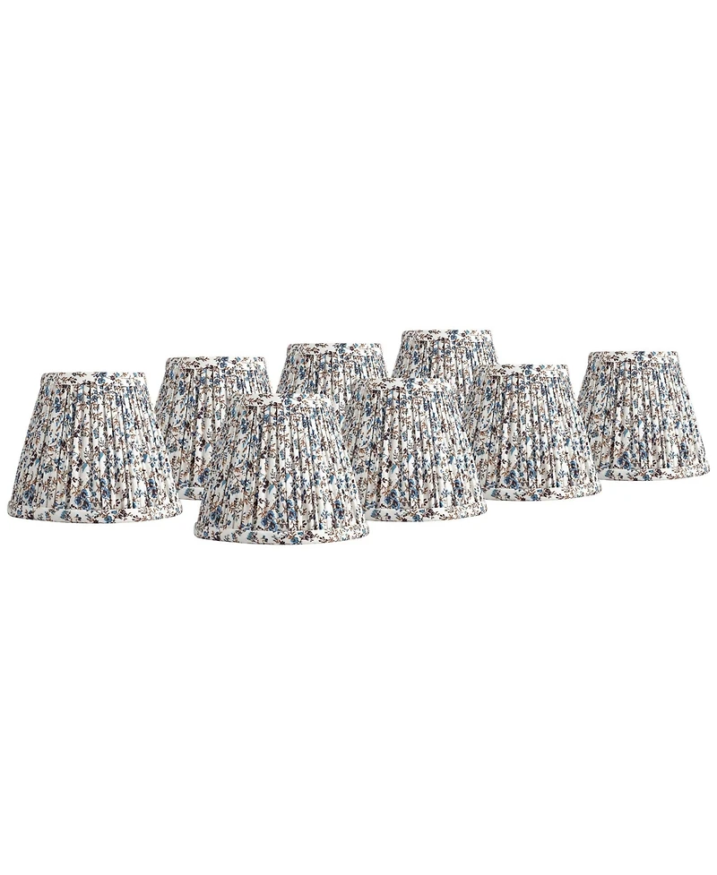 Brighten the look of a fixture or lamp with this set of eight shades from the Springcrest brand. The design has a tight pleat using a blue floral patterned fabric. The decorative pattern is set against a cream color background, and the shade has a white polystyrene liner. Set of eight clip-on lamp shades.
