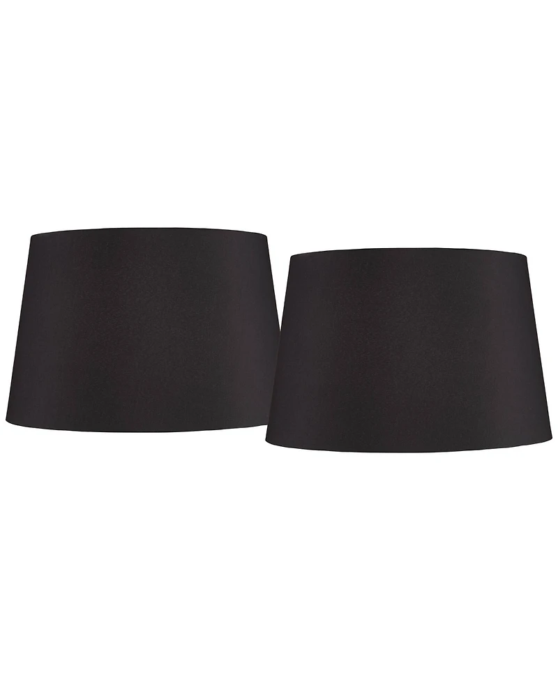 In dramatic black, this set of two hardback tapered drum lamp shades delivers a dramatic touch to table or floor lamps, adding cool vibes to a modern space. The faux silk lamp shades are covered in black poly and cotton fabric with a white unlined interior and rolled trim. A polished brass finish fitter embellishes the romantic look of these modern shades. Each includes are a harp and finial in the correct size.