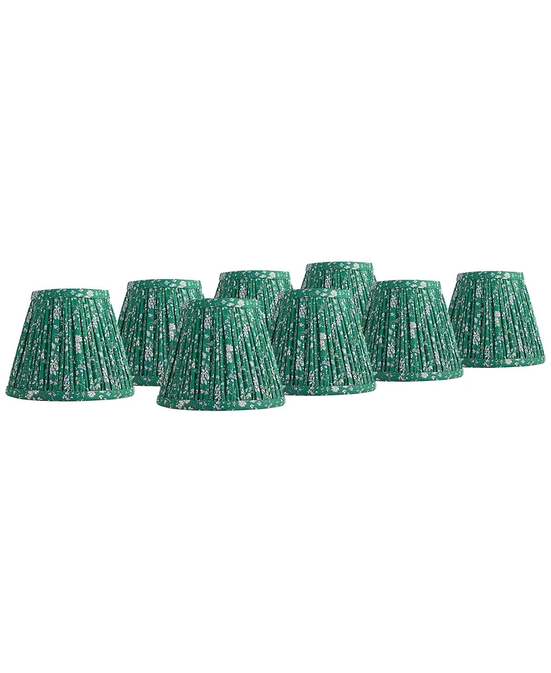 Brighten the look of a fixture or lamp with this set of eight shades from the Springcrest brand. The design has a tight pleat using a violet floral patterned fabric. The decorative pattern is set against a green color background, and the shade has a white polystyrene liner. Set of eight clip-on lamp shades.