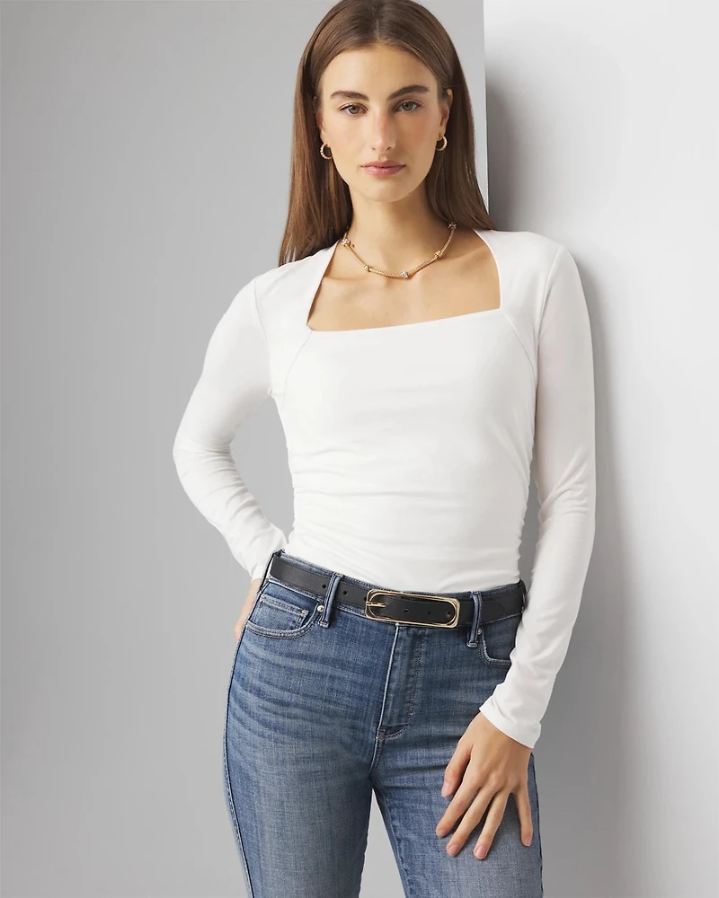 Side ruching creates a texture-rich top that hugs your curves with an incredibly flattering fit. It's finished with a dramatic square-neck and long sleeves. Dress it up with a statement necklace or go casual with jeans. • Long sleeves• Side ruching• Square neckline• Unlined• 23" long from shoulder• 90% Lenzing TENCEL™ Lyocell, 10% Spandex. Machine wash.• Imported