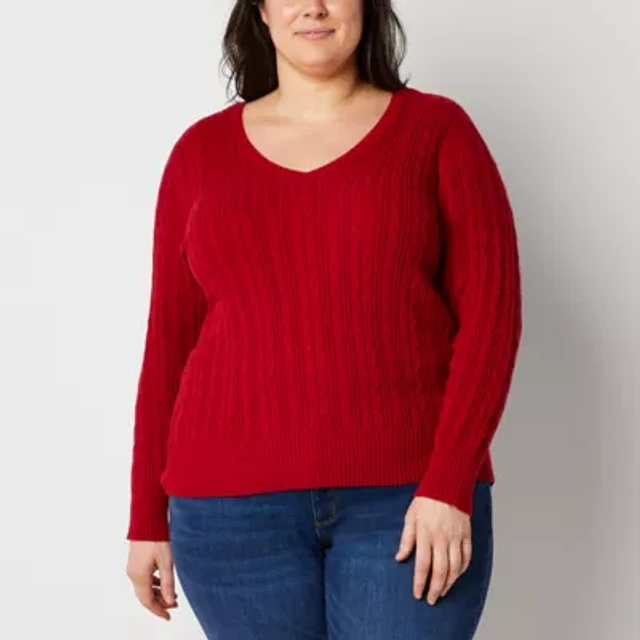 St. John's Bay Plus Womens V Neck Long Sleeve Cable Knit Pullover Sweater