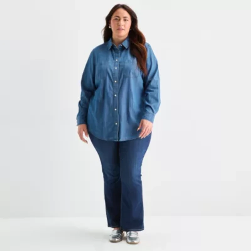 St. John's Bay Womens Plus Easy-on + Easy-off Hidden Access Opening Fitted Long Sleeve Regular Fit Button-Down Shirt