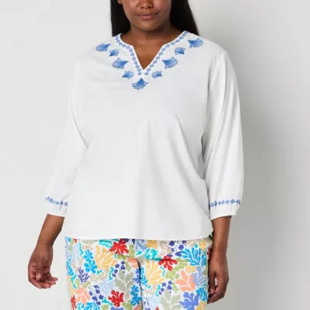 St. John's Bay Womens Plus Split Crew Neck Long Sleeve Embroidered Blouse