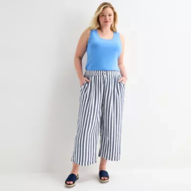 The lightweight cotton of these women's plus St. John's Bay cropped pants are perfect for warmer days and easy styling. They feature an elastic-drawstring waist, side pockets, and wide legs. Pair this crinkled design with a blouse and flats.