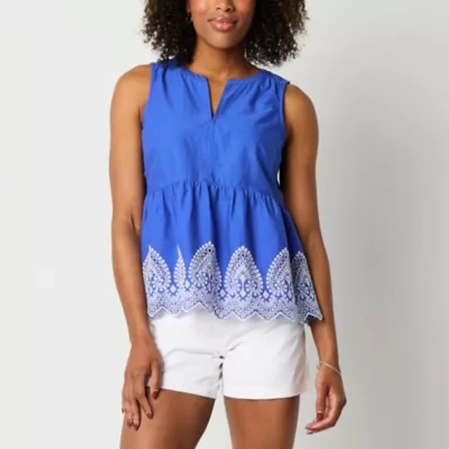 St. John's Bay Womens Split Crew Neck Sleeveless Embroidered Blouse