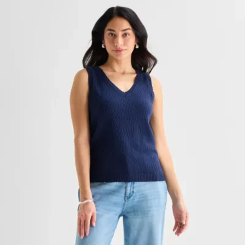 St. John’s Bay women’s v-neck sleeveless pullover sweater updates your wardrobe with a simple silhouette that pairs well with shorts or denim. Made from a textured cotton-knit, it's designed for easy styling and relaxed comfort.